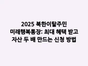 - 2025 북한이탈주민 미래행복통장: 최대 혜택 받고 자산 두 배 만드는 신청 방법새로운 시작, 안정적인 정착을 꿈꾸는 모든 북한이탈주민 여러분! 우리 사회에서 단단한 기반을 다지고 미래를 계획하는 것은 쉽지 않은 일입니다. 하지만 걱정 마세요. 정부가 여러분의 든든한 자산 형성을 지원하는 특별한 제도를 마련했습니다. 바로 ‘북한이탈주민 자산형성지원제도’, 일명 ‘미래행복통장’입니다. 이 통장은 여러분이 저축하는 만큼 정부가 매칭 지원금을 더해 자산을 빠르게 불릴 수 … Read more