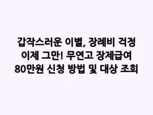 - 갑작스러운 이별, 장례비 걱정 이제 그만! 무연고 장제급여 80만원 신청 방법 및 대상 조회예기치 않은 이별은 늘 힘들지만, 홀로 남겨진 고인의 마지막 길을 존엄하게 배웅해야 하는 상황은 더욱 막막하게 느껴질 수 있습니다. 이러한 어려움에 처한 분들을 위해 정부와 지자체는 ‘무연고 장제급여’를 통해 경제적 부담을 덜어드리고 있습니다. 특히, 무연고 사망자의 존엄한 장례를 위해 최대 80만원까지 지원하는 이 제도는 고인과 유가족 모두에게 큰 위로가 … Read more