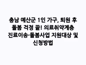 - 충남 예산군 1인 가구, 퇴원 후 돌봄 걱정 끝! 의료취약계층 진료이송·돌봄사업 지원대상 및 신청방법안녕하세요, 복지 정보 전문 블로거입니다. 갑작스러운 질병이나 부상으로 병원에 입원했다가 퇴원한 후, 혼자서 돌봄을 감당해야 하는 상황은 정말 막막할 수 있습니다. 특히 1인 가구 어르신들에게는 더욱 큰 부담이죠. 하지만 이제 걱정하지 마세요! 충남 예산군에서는 의료취약계층의 건강한 일상 복귀를 돕기 위한 특별한 사업을 진행하고 있습니다. 바로 ‘의료취약계층 진료이송·돌봄사업’인데요, 이 사업이 … Read more