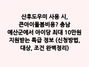 - 산후도우미 사용 시, 큰아이돌봄비용? 충남 예산군에서 아이당 최대 10만원 지원받는 특급 정보 (신청방법, 대상, 조건 완벽정리)새로운 생명의 탄생은 축복이지만, 동시에 가정에 큰 변화와 함께 여러 가지 고민을 안겨줍니다. 특히 둘째, 셋째 아이를 출산하고 산후조리를 할 때, 첫째 아이 돌봄은 많은 부모님들의 걱정거리 중 하나일 텐데요. 산후도우미를 이용하더라도 큰아이 돌봄은 여전히 큰 숙제로 다가옵니다. 이런 부모님들의 부담을 덜어드리고자 충청남도 예산군에서 ‘큰아이돌봄비용지원’ 정책을 시행하고 있습니다. 산후조리 … Read more