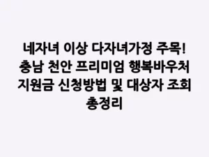 - 네자녀 이상 다자녀가정 주목! 충남 천안 프리미엄 행복바우처 지원금 신청방법 및 대상자 조회 총정리사랑스러운 네 자녀 이상을 양육하고 계신 부모님들, 매일이 행복하지만 동시에 만만치 않은 경제적 부담과 육아의 어려움을 느끼고 계실 겁니다. 정부와 지자체는 이러한 다자녀 가정을 위한 다양한 지원책을 마련하고 있는데요, 오늘은 그중에서도 특히 충청남도 천안시 다자녀 가정을 위한 반가운 소식, ‘네자녀이상 다자녀가정 프리미엄 행복바우처 지원사업’에 대해 자세히 알려드리겠습니다! 이 사업은 … Read more