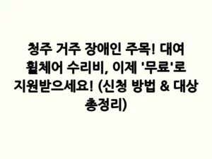 - 청주 거주 장애인 주목! 대여 휠체어 수리비, 이제 ‘무료’로 지원받으세요! (신청 방법 & 대상 총정리)갑작스러운 휠체어 고장으로 이동에 불편을 겪으셨나요? 비싼 수리비 부담 때문에 망설이다가 불편함을 감수하고 계신 분들이 많으실 텐데요. 이제 더 이상 걱정하지 마세요! 충청북도 청주시에서는 대여용 휠체어 수선비를 지원하여 장애인분들의 이동권 증진과 경제적 부담 완화를 돕고 있습니다. 특히 청원구에 거주하시는 분들이라면 이 글을 통해 상세한 지원 내용을 확인하시고 혜택을 놓치지 … Read more