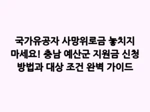 - 국가유공자 사망위로금 놓치지 마세요! 충남 예산군 지원금 신청 방법과 대상 조건 완벽 가이드나라를 위해 헌신하신 국가유공자분들의 희생은 우리 사회의 소중한 밑거름입니다. 하지만 안타깝게도, 그분들이 영면하신 후 남겨진 가족들은 슬픔과 함께 예상치 못한 경제적 어려움에 직면하기도 합니다. 이러한 상황 속에서 국가와 지자체는 유가족의 어려움을 덜고 국가유공자의 숭고한 정신을 기리기 위한 다양한 지원 정책을 펼치고 있습니다. 오늘은 충청남도 예산군에 거주하시거나 관련된 분들을 위한 … Read more