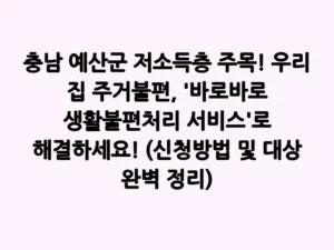 - 충남 예산군 저소득층 주목! 우리 집 주거불편, ‘바로바로 생활불편처리 서비스’로 해결하세요! (신청방법 및 대상 완벽 정리)갑작스러운 주택 고장, 낡은 시설물 교체, 혹은 간단하지만 혼자서는 해결하기 어려운 생활 속 불편들… 특히 저소득 취약계층에게는 이러한 문제들이 큰 부담으로 다가올 수 있습니다. 충청남도 예산군에서는 이러한 주민들의 어려움을 덜어드리고자 ‘바로바로 생활불편처리서비스 지원사업’을 운영하고 있는데요. 오늘은 이 사업이 무엇인지, 누가 어떻게 신청할 수 있는지 자세히 알아보겠습니다! 1. 바로바로 생활불편처리서비스, … Read more