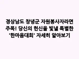 - 경상남도 창녕군 자원봉사자라면 주목! 당신의 헌신을 빛낼 특별한 ‘한마음대회’ 자세히 알아보기어려운 이웃을 위해 묵묵히 봉사해 오신 자원봉사자 여러분, 진심으로 감사합니다. 때로는 보이지 않는 곳에서 빛나는 땀과 노력에 지칠 때도 있으셨을 텐데요. 여러분의 헌신을 기억하고 격려하며, 더 많은 분들이 봉사의 기쁨을 나눌 수 있도록 지자체에서 특별한 자리를 마련했습니다. 바로 ‘자원봉사자 한마음대회’입니다. 이 행사가 어떤 의미를 가지고 여러분께 어떤 활력을 불어넣을지 … Read more