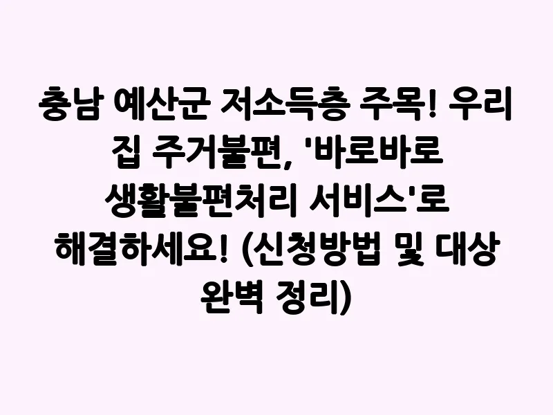 갑작스러운 주택 고장, 낡은 시설물 교체, 혹은 간단하지만 혼자서는 해결하기 어려운 생활 속 불편들… 특히 저소득 취약계층에게는 이러한 문제들이 큰 부담으로 다가올 수 있습니다. 충청남도 예산군에서는 이러한 주민들의 어려움을 덜어드리고자 ‘바로바로 생활불편처리서비스 지원사업’을 운영하고 있는데요. 오늘은 이 사업이 무엇인지, 누가 어떻게 신청할 수 있는지 자세히 알아보겠습니다!